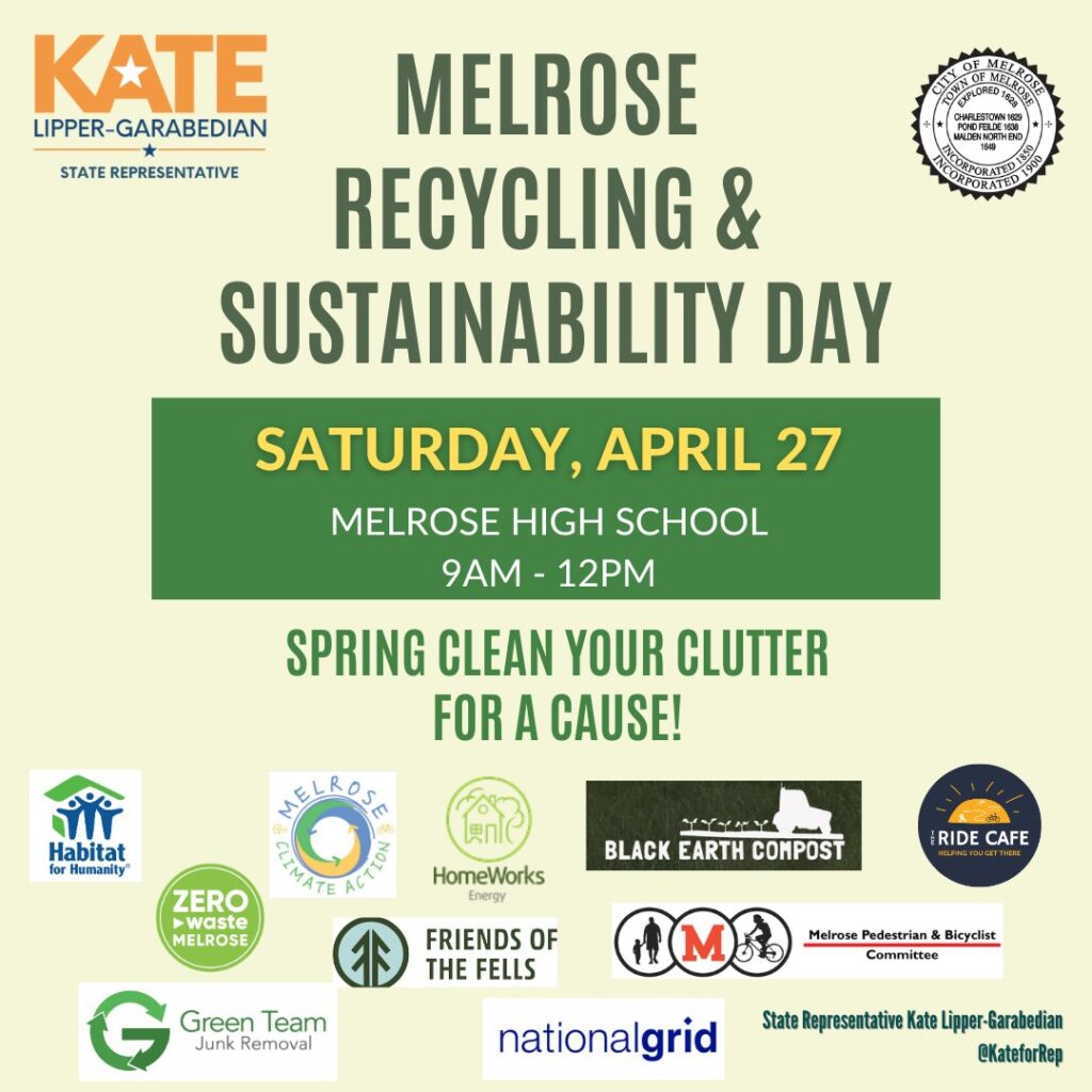 Stop in at State Representative Kate Lipper-Garabedian’s third annual Recycling and Sustainability event in the parking lot of Melrose High School. Bring your unused items to be recycled or donated by Green Team Junk Removal (some fees may apply), or drop off your old dehumidifier and receive a $30 rebate from National Grid.