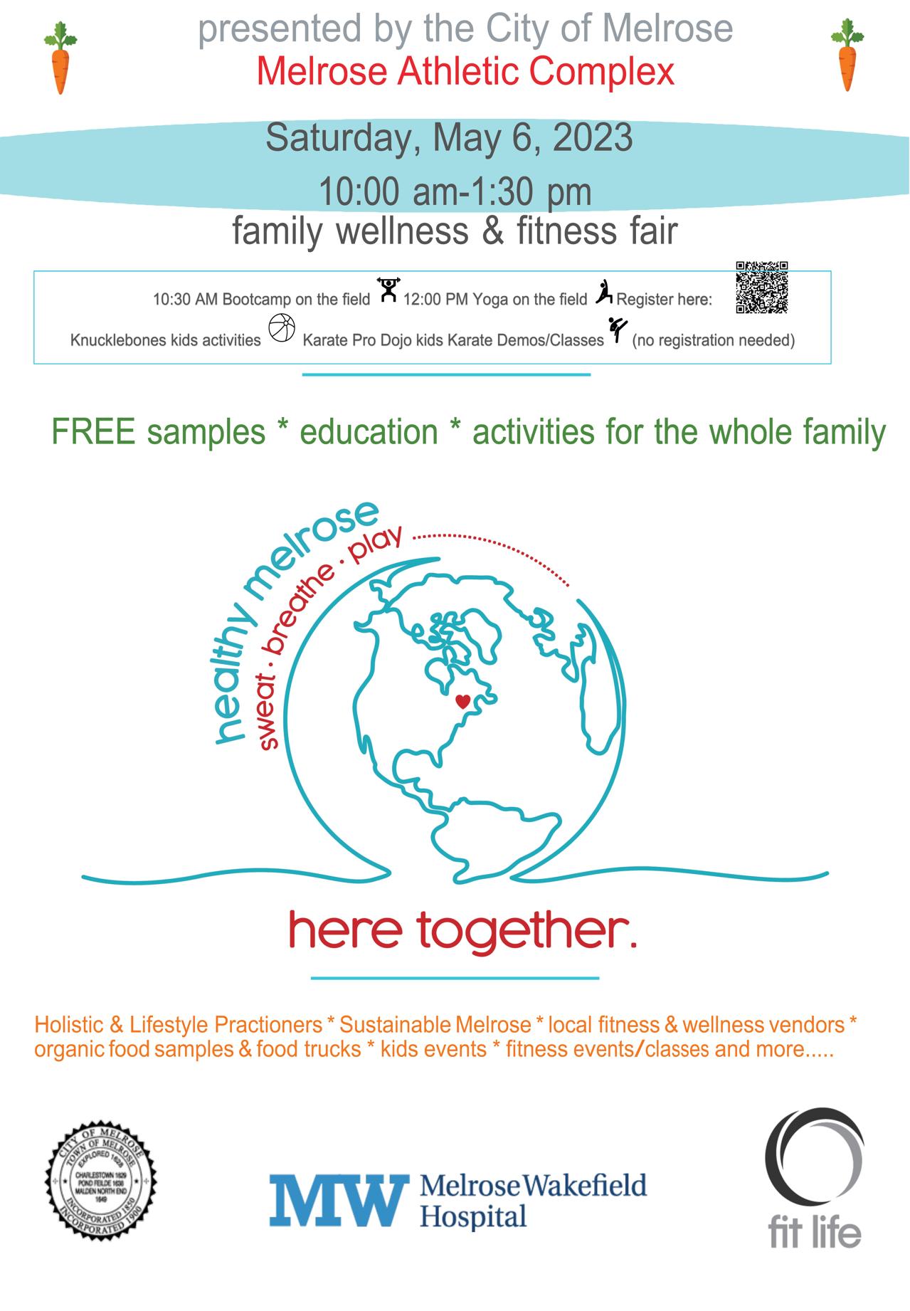Melrose Athletic Complex (Fred Green Memorial Field), Melrose Melrose Athletic Complex (Fred Green Memorial Field), Melrose, Massachusetts, USThe City of Melrose presents Healthy Melrose 2023, a family wellness and fitness fair. Bring the whole family and participate in fitness events, meet wellness providers, sample organic produce, and learn how to take better care of our planet.